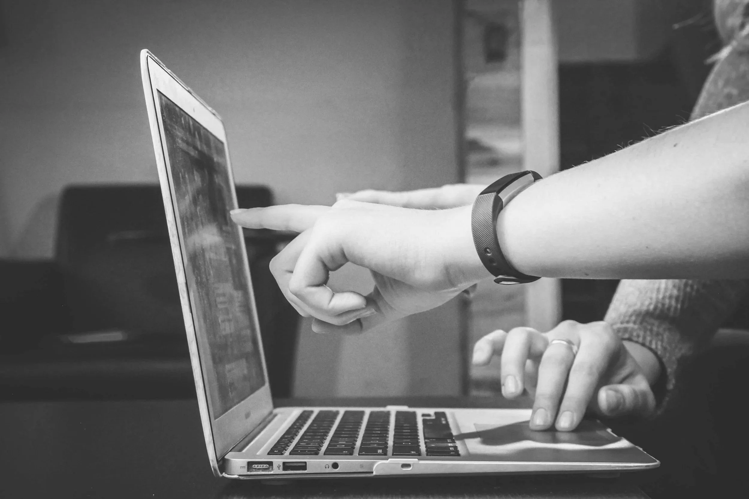 A person using a laptop, touching the screen, in a black-and-white photograph.